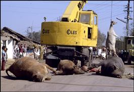 INDIA. Bhopal. 1984. A man carries the body of his dead wife...