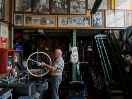 ITALY. Milan. 2016. Alberto Masi building a bicycle inside his...