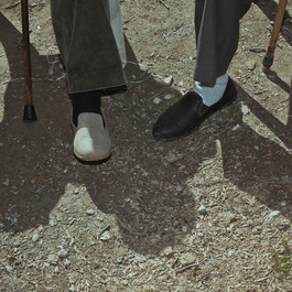 SPAIN. 2010. Detail of the shoes of two men in the patio of their...