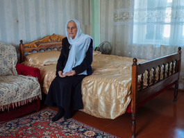 AZERBAIJAN, Astara. 2018. Farbiya Shabanova, 78 sits on her bed...