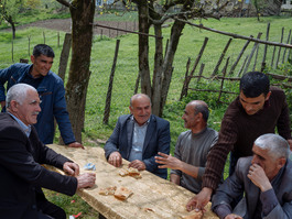 AZERBAIJAN, Lerik. 2018. Men chat after a family lunch in Zarikumecu...
