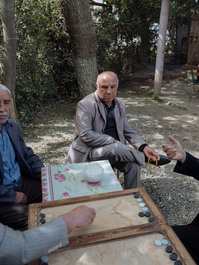 AZERBAIJAN, Lankaran. 2018. Men play backgammon in a small coffee...