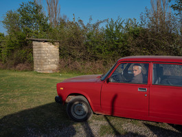 AZERBAIJAN, Astara. 2018. Men stand near a car in Alasha village.