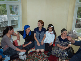 AZERBAIJAN, Lerik. 2018. Women chat and laugh in a living room...
