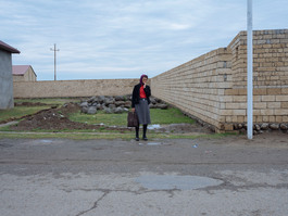 AZERBAIJAN, Astara. 2018. A woman waits for the village bus in...