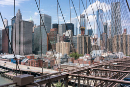 USA. New York. Lower Manhattan, seen from the Brooklyn Bridge....
