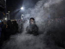 IRAN. 2015. An Iranian woman walks through a haze of smoke caused...
