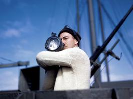 ATLANTIC OCEAN. 1941. A crewman of a Cunard freighter signals...