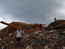 PERU. Iquitos, Lima. September 2017. Men carrying timber up a...