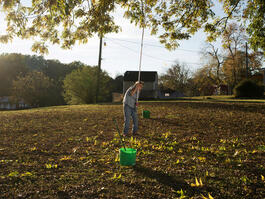 USA. Yalobusha County, Mississippi. 2017. Christie picking pecans....