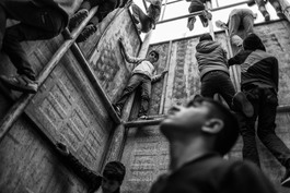 TURKEY. Diyarbakir. March 2016. Children climb a platform adorned...
