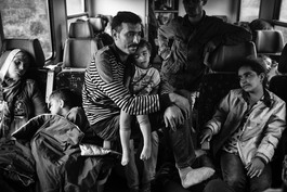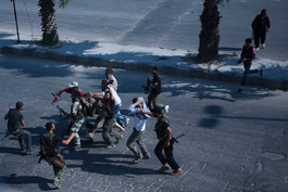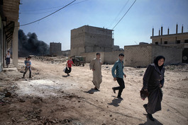 SYRIA, Aleppo. 2012. A family flees their home during heavy bombing...