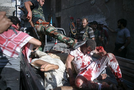 Syria. Aleppo. August 2012. A family tries to escape from their...
