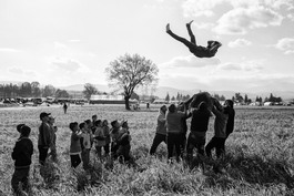 GREECE. April 2016. Refugees play near the Idomeni camps on Greek-Macedonian...
