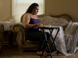 USA. Fesno, CA. 2017. Carey at home. Carey, originally Edin,...