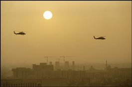 IRAQ. Baghdad. Two US combat helicopters at sunset over the skyline...