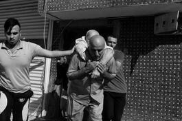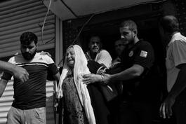 Akcakale, Turkey, 2019. A woman is evacuated from a building...