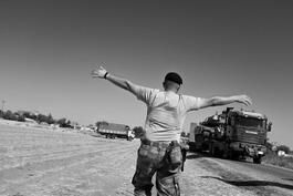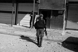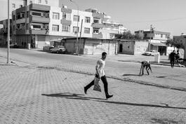 Akcakale, Turkey, 2019. A man desperately sits as mortars land...