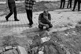 Akcakale, Turkey, 2019. A man mourns near the grave during a...