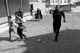 Akcakale, Turkey, 2019. Turkish police yells people to hide...