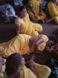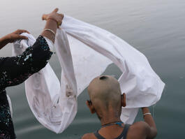 INDIA. Delhi. 2019. A woman bathes in the Yamuna river.
