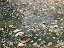 INDIA. Delhi. 2019. Debris and religious flowers by the banks...
