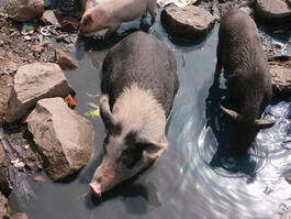 INDIA. Delhi. 2019. Pigs in pulluted ground water in a illegal...
