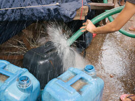 INDIA. Delhi. 2019. Water delivery from a truck in Kusumpur Pahar...
