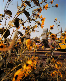 USA. Omaha, Nebraska. 2005-2018. Downtown seen through sunflowers....