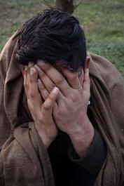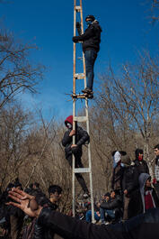 Turkey, Edirne. 2020. A migrant waits desperetaly in buffer zone...