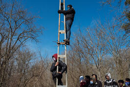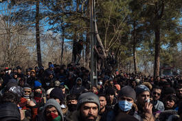 Turkey, Edirne. 2020. Migrants wait in buffer zone between Turkish...