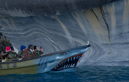 CHILE. Patagonia. 2019. Tourists passing by in a boat at the...