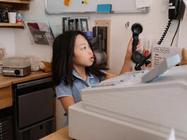 GB. London. April 20, 2020. Nono helps her dad out at their cafe,...