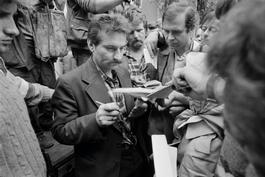 POLAND. Gdansk. Lenin Shipyard strike. Lech Walesa signing autographs...