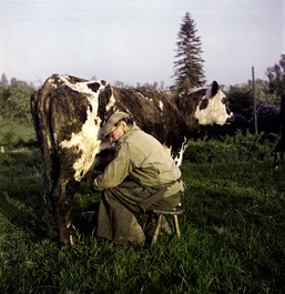 FRANCE. Normandy. 1947. A farmer wearing a discarded US Army...