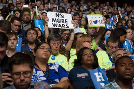USA. Philadelphia, PA. 2016. Bernie Sanders delegates listen...