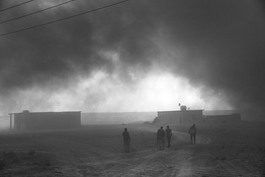 IRAQ. 2016. Men appearing out of a dark cloud of burning oil...
