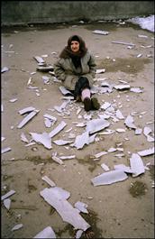 02/2000. A Chechen woman in the rubble of her house, bombed by...