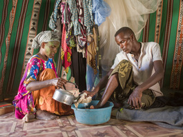 Djibouti. Obock. 2015. Medina, a refugee from Eritrea, pours...