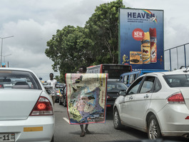 Ghana. Accra. 2016. Hawkers walking between cars in a traffic...