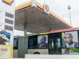 Ghana. Accra. 2016. A bus refuelling at a Shell fuel station...