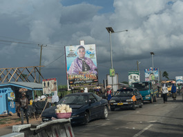 Ghana. Accra. 2016. A hawker selling maps walks between two lines...