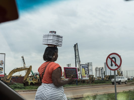 Ghana. Tema. 2016. Hawker on road near Tema port.