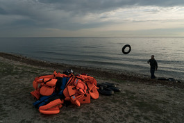 GREECE. Lesbos. March, 2016. Refugee boats, rafts, and lifejackets...