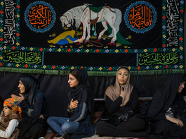 IRAN. 2015. An Iranian woman walks through a haze of smoke caused...