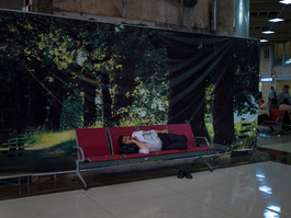 A man sleeps on a bench in Tehran's domestic Mehrabad airport....