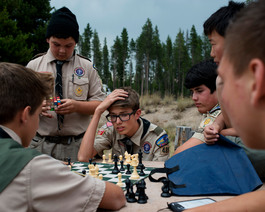 USA. Bend, OR. 2015. Boyscouts from LA at a rest stop. They are...