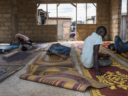 Ghana. Accra. Agbogbloshie. 2016. Muslim workers praying and...