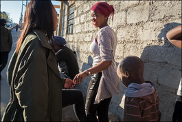 South Africa. Alexandra. Friends stop to chat and laugh on...
