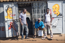 South Africa. Soweto. A unisex hairdressers shack in the township,...